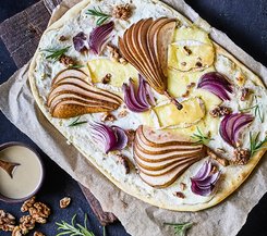 Knuspriger Flammkuchen, verfeinert mit Ziegenfrischkäse, Camembert und Birnen.