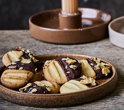 Zarte Plätzchen mit feinem Vanillegeschmack, zur Hälfte in Zartbitterschokolade getaucht und mit Apfelchips verfeinert.