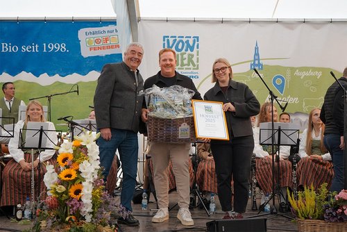 Ein Tag für die Regionalität: Amelie und Hannes Feneberg (links) gemeinsam mit VonHier-Gemüselieferant Philip Mayer (Mitte) bei der feierlichen Eröffnung des VonHier-Hoffests.