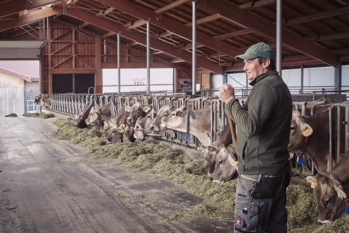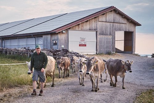 Vorzugsmilch, das Aushängeschild des Betriebs, wird von den Lerfs mit größter Sorgfalt produziert. „Vorzugsmilch ist Rohmilch, wie sie aus dem Euter der Kuh kommt. Selbstverständlich gefiltert und gekühlt. Unsere Vorzugsmilch ist, wie sie war und wie sie auch sein soll – natürlich, pur und super im Geschmack“, erklärt Katharina Lerf. Die strenge Kontrolle und Einhaltung hoher Qualitätsstandards machen den Betrieb von Familie Lerf zum einzigen Vorzugsmilch-Abfüller in Bayern. Das Hofleben ist für Katharina und Michael Lerf nicht nur Beruf, sondern auch Leidenschaft . Mit vier Kindern und einem Hof, der stetig weiterentwickelt wird, sind sie rund um die Uhr im Einsatz. Auf das Wohlergehen ihrer Allgäuer Braunviehherde legen sie dabei besonders viel Wert: „Unsere Tiere haben ganzjährig Auslauf und können immer zum Sonnetanken raus“, betont Michael Lerf. In den Sommermonaten grasen die Kühe täglich auf den direkt an den Stall angrenzenden Weiden. Im Winter erhalten die Tiere ausschließlich hofeigenes Heu. Die Arbeit im Stall beginnt bereits früh am Morgen, wenn es heißt, die Kühe zu melken und zu füttern. „Raus aus dem Bett und rein in den Stall, lautet unser Motto“, fügt Michael Lerf lachend hinzu. Zwei Stunden dauert die morgendliche Stallarbeit etwa, zwei Personen übernehmen dabei das Melken, während die dritte Person sich um das Füttern, die Versorgung der Kälber oder das frische Einstreuen der Liegeflächen kümmert.