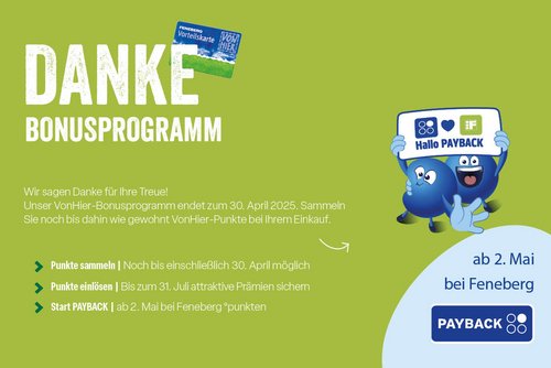 Wir beenden das VonHier-Bonusprogramm zum 30. April 2025 und freuen uns, Ihnen ab 02. Mai mit PAYBACK eine Vielzahl neuer Möglichkeit bieten zu können.