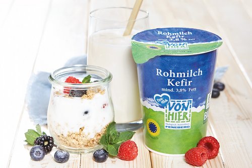 Die Verwendung von Kefir geht über das Trinken hinaus. Die erfrischende Mischung aus leicht säuerlichem Geschmack und einer angenehm cremigen Konsistenz machen Kefir zu einer idealen Basis für Smoothies, Müslis und andere Kreationen. Unser neuer VonHier-Kefir wird von Familie Lerf hergestellt. Der traditionsreiche Milchhof der Lerfs, etwas außerhalb von Ottobeuren, ist ein Juwel in der Milchverarbeitung. Michael Lerf führt zusammen mit seiner Frau Katharina den Betrieb in vierter Generation und stellt neben Vorzugsmilch, Joghurt und Fruchtjoghurt auch den ganz neuen Kefir für VonHier her.
