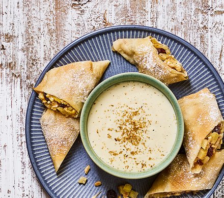 - Creme zubereiten: Quark, Joghurt, Zucker, Apfelsaft , Zitronenabrieb und etwas geriebene Tonkabohne verrühren. In Gläser füllen und mit den Apfelstrudel-Röllchen servieren.
