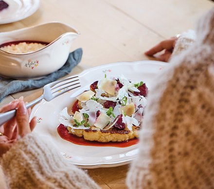 - Zuletzt auf einem Teller die Blumenkohl scheiben sowie die Rote Bete und das Orzotto anrichten. Mit der Rote-Bete-Soße sowie einig