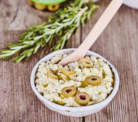 - Mit Pfeffer abschmecken und in eine Schale geben. Zuletzt mit etwas Olivenöl beträufeln und mit Oliven dekorieren.