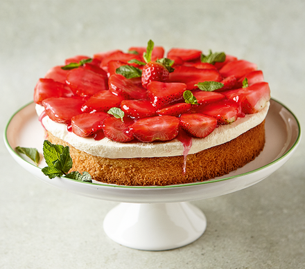 In der Zwischenzeit Erdbeeren waschen und abtropfen lassen. Den Stiel entfernen und sie halbieren. Die Torte damit belegen. Tortenguss gemäß der Packungsanleitung zubereiten und vorsichtig mit einem Löffel über die Torte geben.