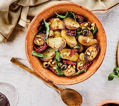 Frischer mediterraner Kartoffelsalat mit gegrillten Drillinge, Oliven und Pinienkernen