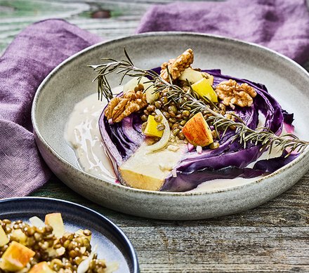 - Blaukraut backen: Die Blaukrautscheiben auf ein mit Backpapier belegtes Backblech legen und mit ½ EL Rapsöl bestreichen. Knoblauch darauf verteilen und leicht salzen. Das Blaukraut im vorgeheizten Ofen bei 180 °C (Heißluft ) etwa 20 Minuten backen. Das Blech herausnehmen, Rosmarinzweige auf dem Blaukraut verteilen und die Walnüsse daneben auf das Blech legen. Alles zusammen für weitere 15 Minuten backen, bis das Blaukraut weich und die Walnüsse leicht geröstet sind.