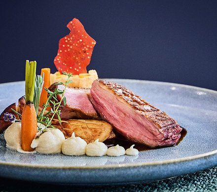 - Entenbrust: Hautseite der Entenbrüste rautenförmig einschneiden, mit Salz und Pfeffer würzen. In kalter Pfanne auf Hautseite bei mittlerer Hitze 5 bis 7 Min. knusprig anbraten. Knoblauch und Kräuter dazugeben, wenden und 3 bis 4 Min. weiter braten. Im vorgeheizten Ofen bei 180 °C (Umluft ) 10 bis 12 Min. fertig garen. 5 Min. ruhen lassen.