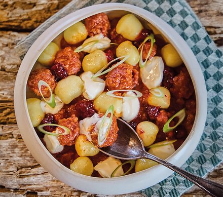 - Die Gnocchi in siedendem Wasser garen, nach etwa 3 Min. schwimmen sie oben. Dann direkt auf einen Teller geben und mit der Soße anrichten. Zuletzt mit etwas Crème fraîche sowie Preiselbeeren garnieren.