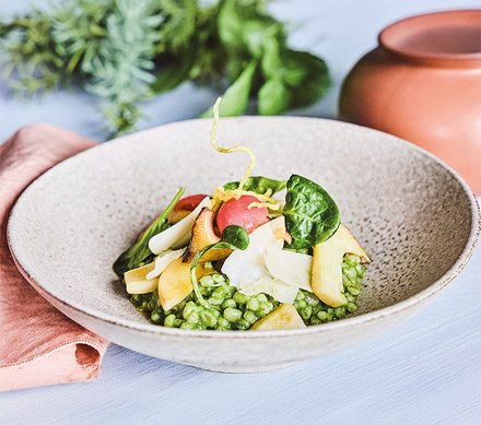 - Die Schalottenwürfel in Olivenöl anschwitzen, dann die Graupen hinzufügen und kurz dünsten.