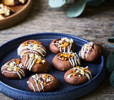 - Samba Dark in einen Spritzbeutel geben und die Plätzchen damit füllen. Kuvertüre hacken, schmelzen und ebenfalls in Spritzbeutel füllen, eine Ecke abschneiden. Plätzchen nach Belieben mit der Kuvertüre verzieren und mit etwas Orangenabrieb und den gehackten Cashewkernen dekorieren.