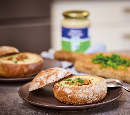 - Zuletzt anrichten: Krusti auf einem Teller anrichten, die Suppe aus dem Wasser nehmen, das Glas öffnen und je die Hälfte in ein Krusti füllen. Mit Croûtons und Schnittlauch garnieren.