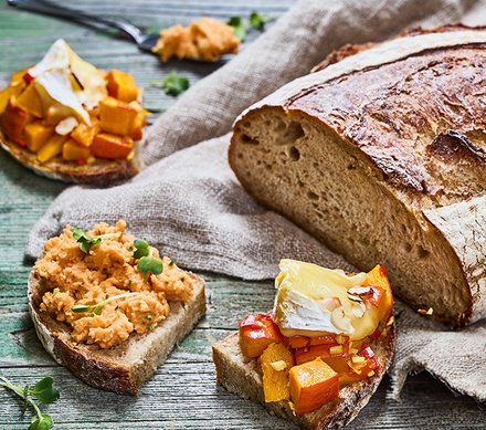 - Bruschetta anrichten: Die Kürbiswürfel auf den gerösteten Brotscheiben verteilen, je eine Ecke des warmen VonHier-Camemberts darauflegen und den Käse mit einer Gabel leicht zerdrücken. Das Kürbiskernöl darüber träufeln und die gehackten Kürbiskerne und eine Prise Salz darüberstreuen.