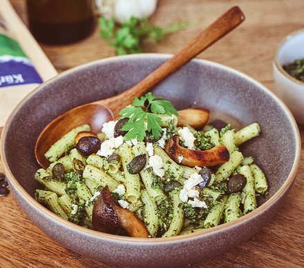 - Nudeln mit dem Kürbiskernpesto vermengen – bei Bedarf etwas Nudelwasser hinzufügen, bis die Soße schön cremig ist. Die gebratenen Kräuterseitlinge darübergeben und nach Belieben mit Feneta bestreuen.