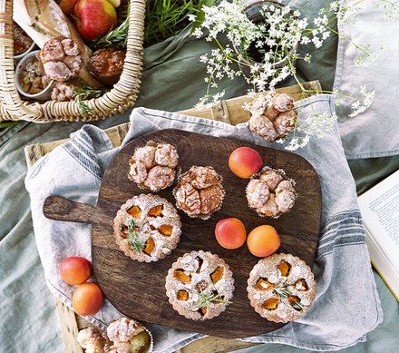 Im heißen Ofen ca. 20 Minuten backen. In der Zwischenzeit den Puderzucker mit der Sahne verrühren. Muffin aus dem Ofen neh - men und sofort mit dem Guss beträufeln. Lauwarm oder kalt servieren