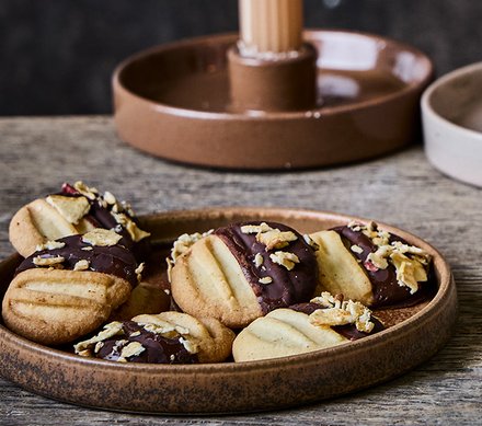 - Kuvertüre hacken, schmelzen und Plätzchen zur Hälft e in die Schokolade eintunken. Apfelchips kleinhacken und über die Plätzchen streuen.