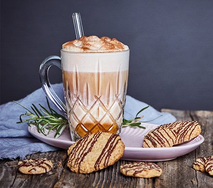 - Einen Espresso in das Glas geben und den fertigen Latte mit Pumkin-Spice-Gewürzmischung verfeinern.