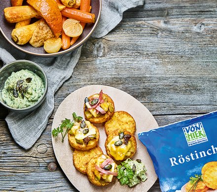 - Röstinchen: Röstinchen nach Packungsanweisung zubereiten. Birnenkompott auf die Röstinchen geben, mit Raclettekäse und Lachsschinkenstreifen belegen. Im Ofen bei 220 °C backen, bis der Käse geschmolzen und leicht gebräunt ist.