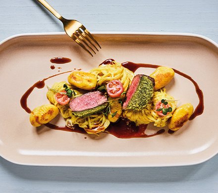 - Das Fleisch mit Salz und Pfeffer würzen, dann scharf anbraten. Anschließend mit der vorbereiteten Bärlauchkruste bestreichen und im vorgeheizten Ofen bei 180°C etwa 8–10 Min. fertig garen.