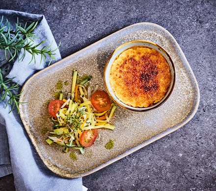 - Crème-Brûlée: Schafsjoghurt und Sahne erwärmen und glattrühren. Mit Knoblauch, Salz, Cayenne-Pfeffer, Zitronenabrieb und Thymianblättern würzen. Bei etwa 60 °C vom Wasserbad nehmen und Eigelbe unterrühren. Mit Meersalz abschmecken. Die Schafscreme in 2 feuerfeste Förmchen füllen und im Backofen bei 90 °C Heißluft etwa eine Stunde garen, bis die Masse gestockt ist. Über Nacht abkühlen lassen.