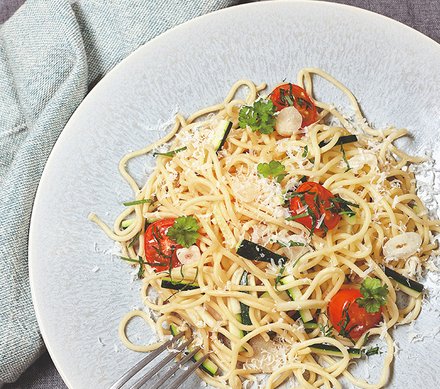 - Öl erhitzen, Knoblauch und Petersilie darin andünsten. Tomaten und Zucchini dazugeben und kurz erwärmen.