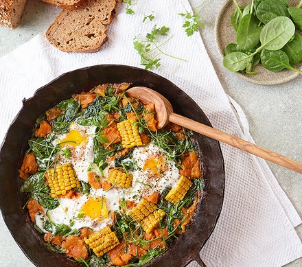 - Anschließend mit einem Kochlöffel vier freie Stellen in der Pfanne für die Eier schaffen. Die Eier aufschlagen und an die jeweilige Stelle geben. Stocken lassen. Die angebratenen Maisstücke darauf verteilen. Zuletzt mit frischen Kräutern, wie Petersilie und Thymian, anrichten und servieren.