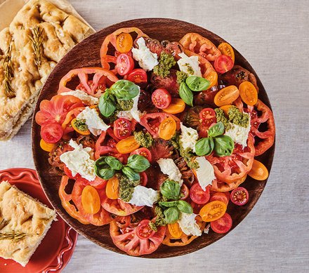- Tomaten waschen und in gleichmäßige, runde Scheiben schneiden. Anschließend dekorativ auf einem großen Teller auslegen.