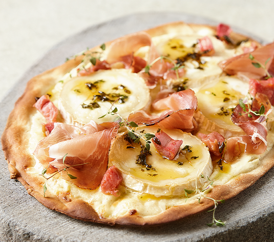 Flammkuchen mit Thymian-Ziegenkäse und Rhabarber