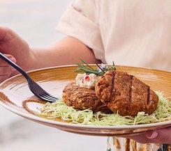 - Die Brust vom Knochen auslösen und rundherum mit Sonnenblumenöl goldbraun anbraten. Bei 120 °C Ober- und Unterhitze für 20 Min. in den Ofen geben. Danach auskühlen lassen und tranchieren.