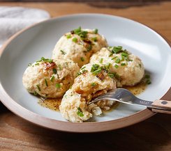 Fluffige Käsenocken mit würzigem Bergkäse, goldbrauner Butter und frischem Schnittlauch – ein einfaches Wohlfühlgericht.