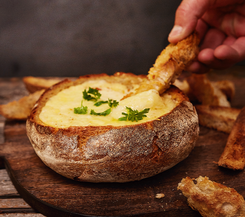 Herzhaft und raffiniert! Aromatische Käsesuppe, serviert in knusprigen Roggenkrusti, garniert mit Croûtons.