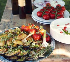Leichte, mediterrane Küche: Gegrilltes Gemüse in einer frischen Zitronen-Thymian-Marinade, serviert mit VonHier-Mozzarella.