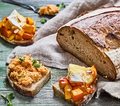 Knuspriges Dinkelbrot, belegt mit gebackenem Kürbis und Camembert, verfeinert mit Kürbiskernöl.