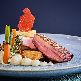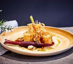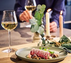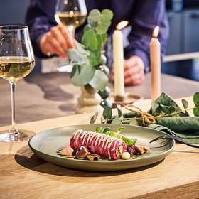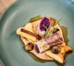 Ein Festtagsklassiker! Knusprig gebratene Entenbrust, begleitet von zarten Kräuterseitlingen und einem Kartoffel-Kürbis-Strudel.