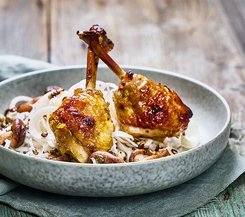 Zart marinierte Drumsticks in einer süß-würzigen Bier-Honig-Glasur, serviert mit aromatischen Linsen, Rettich und Shiitake-Pilzen.
