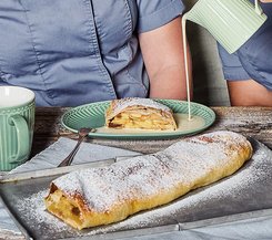 Knusprig gebackener Strudel, gefüllt mit aromatischem Blaukraut, süßen Äpfeln und zarten Maronen.