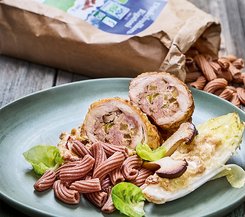 Herzhaft und raffiniert! Zartes Pollo Fino, gefüllt mit Brätmischung, Äpfeln und Kräuterseitlingen, dazu ein Chicorée-Gratin.