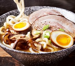 Kräftige Ramen mit Rinderbrühe, zartem Chashu-Schweinebauch, Shiitake, Udon und Ei – eine aromatische Wohlfühl-Schale.