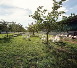 „Das war gar nicht so einfach, denn mein Opa betrieb damals nur noch Ackerbau“, sagt der Junior – der aber unbedingt Tiere halten will. Um seinen Traum zu verwirklichen, startet Josef Heinzler ein für sein damaliges Alter ungewöhnliches Projekt: Er baut mehrere, sich auf rund 3.000 Quadratmeter erstreckende Aufzuchthallen für Puten. Das Wohl der Tiere ist ihm wichtig, deshalb stellt er seine Landwirtschaft 2010 auf „bio“ um und schließt sich dem Naturland-Verband an. „Mir ist vor allem wichtig, dass die Tiere Platz haben“, unterstreicht Heinzler. Um Stress zu vermeiden, teilt er die Puten auf mehrere Herden auf. An jeden Stall schließen sich Wintergärten und Freilaufflächen an, wo die Puten ihren natürlichen Bedürfnissen nachgehen können: Umherlaufen zum Beispiel oder Sandbaden und Gefieder putzen.