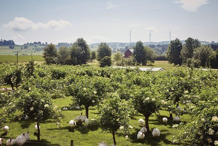 Der Holunder ist mittlerweile ein festes Standbein für den landwirtschaftlichen Betrieb, der im Haupterwerb geführt wird. Ende Mai werden die Blüten geerntet, die zu Sirup weiterverarbeitet werden. Rund 30 Prozent der Blüten reifen zu Beeren heran. Diese werden Anfang September geerntet und zu Saft gepresst. Übrigens hatte Josef Heinzler schon ein Interesse für den Holder lange bevor er selbst zum Obstbauer wurde: „Als ich 18 war, sind wir nach Kroatien in den Urlaub gefahren“, erzählt er. „Damals habe ich in der Steiermark eine interessante Plantage gesehen, die ich fotografiert habe.“ Zu Hause zeigte er seiner Mutter, einer ausgebildeten Gärtnerin, das Foto. Und erfuhr so, dass es sich um Holunder handelte. Als er einige Jahre später selbst in den Anbau dieser Pflanze einstieg, half ihm ein Bauer aus der Steiermark, sich in das Thema einzuarbeiten.