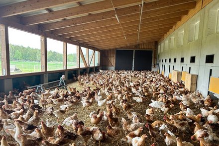Auf rund 25 Hektar bewirtschaftet die Familie Felder, Mutterkühe und Bio-Hähnchen. Etwa 4.800 Hähnchen leben auf Stroh, mit Wintergarten, Sandbädern und Auslauf ins Grüne. „Wenn frisch eingestreut ist - das lieben die Hähnchen“, sagt Sebastian Hornung. Die Mutterkühe leben in einem offenen, naturnahen Stall auf Stroh, der ihren Bewegungsdrang und ihr Ruhebedürfnis berücksichtigt. „Die Tiere sind entspannt, man merkt, dass sie sich wohlfühlen. Genau das ist uns wichtig“, erklärt Sebastian Hornung. Neben der Tierhaltung ist der Hof ein Ort des Lernens: Schulklassen, Familien oder Besucher erfahren hier, wie Bio-Landwirtschaft funktioniert und wie Menschen und Tiere miteinander leben. Kathrin Stempfel begleitet die Gruppen, beantwortet Fragen und zeigt den Alltag auf dem Hof.